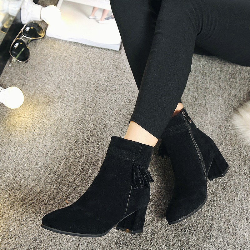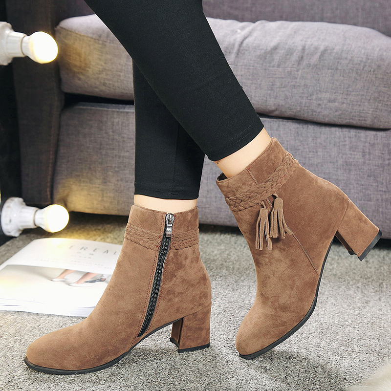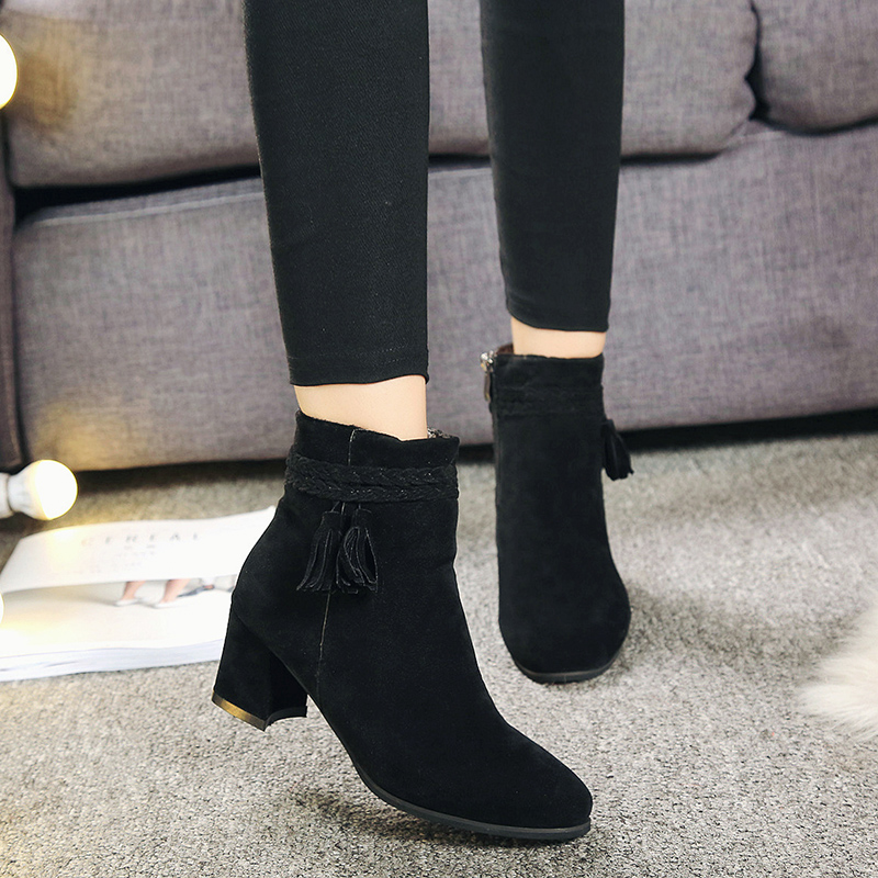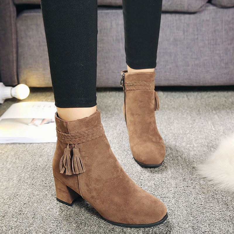 2016秋冬季女靴子靴子韩版潮时尚保暖防滑绒面短靴 高跟鞋粗跟
