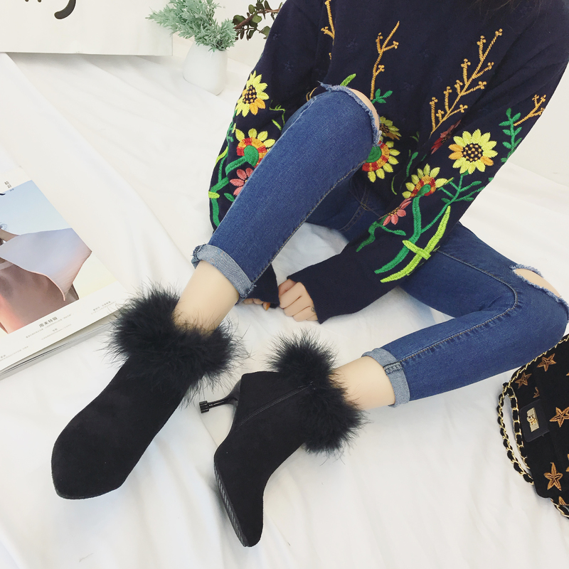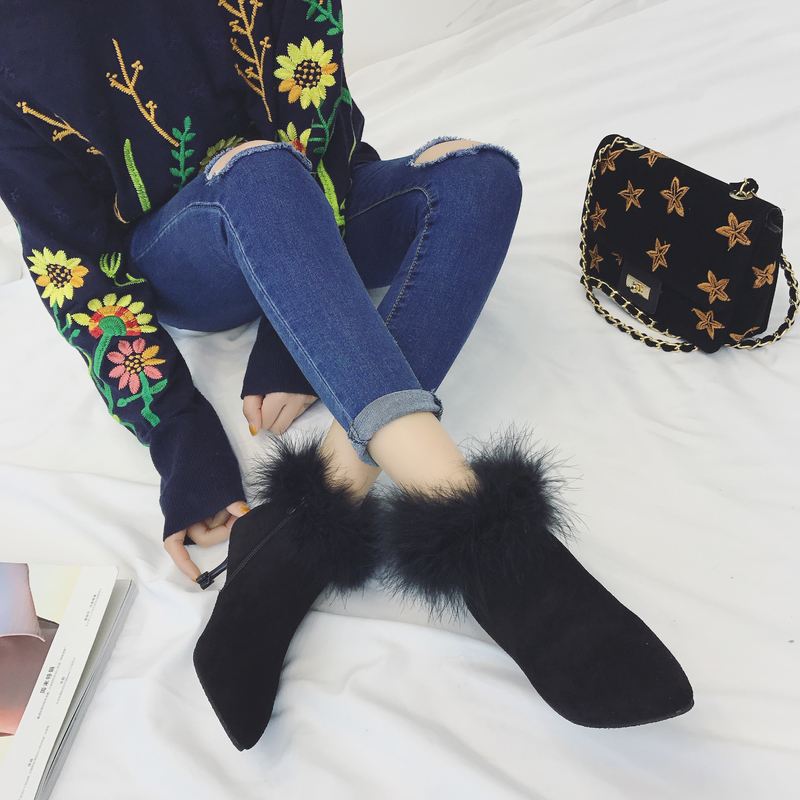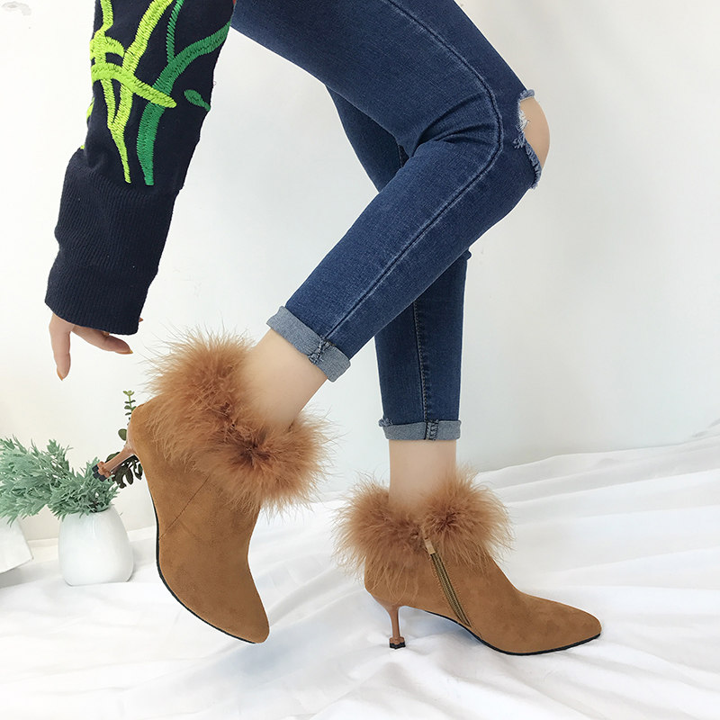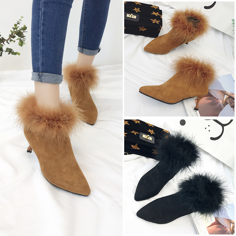 2018秋冬女靴子靴子韩版潮时尚保暖防滑绒面短靴尖头 高跟鞋细跟