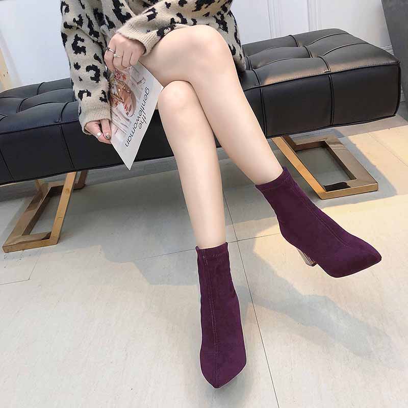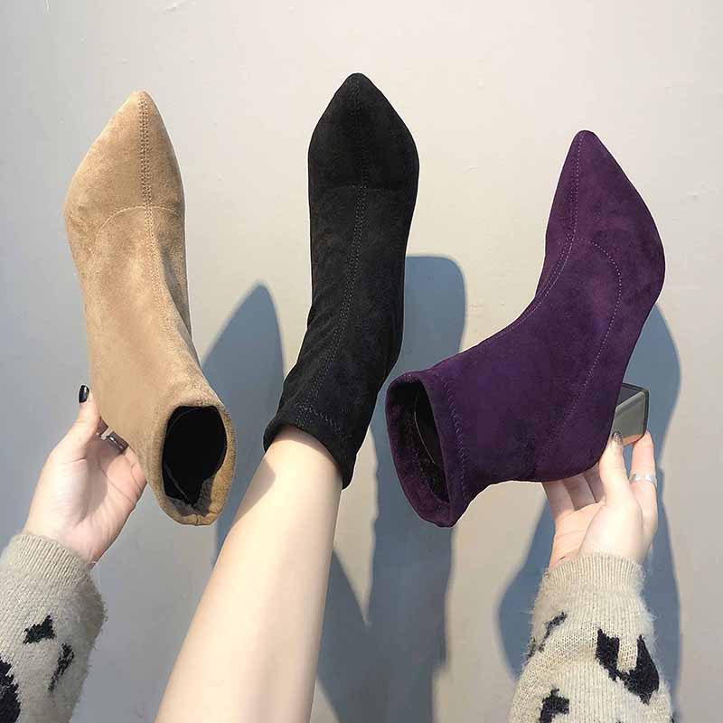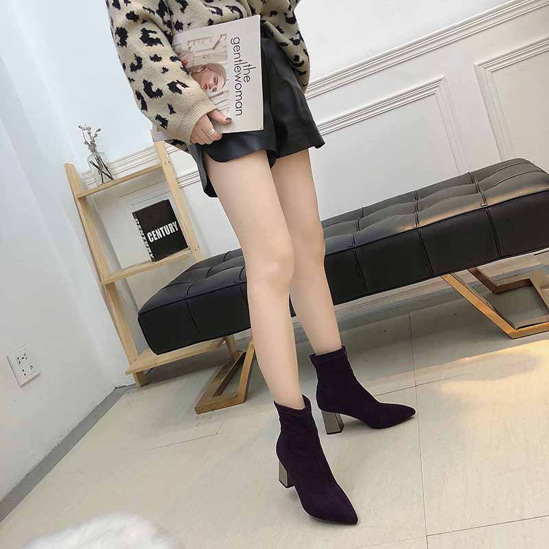 2018秋冬女靴子靴子韩版潮时尚保暖防滑绒面短靴尖头 高跟鞋粗跟