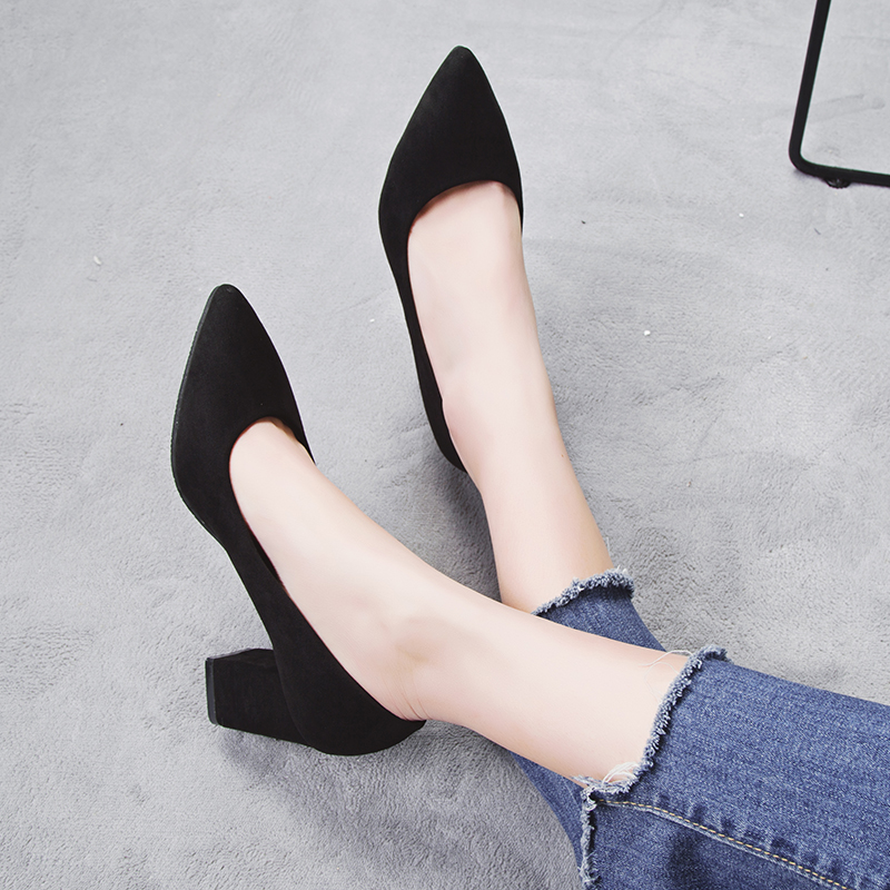 2021春夏季新款单鞋女鞋子低帮鞋韩版时尚学生绒面浅口尖头粗跟