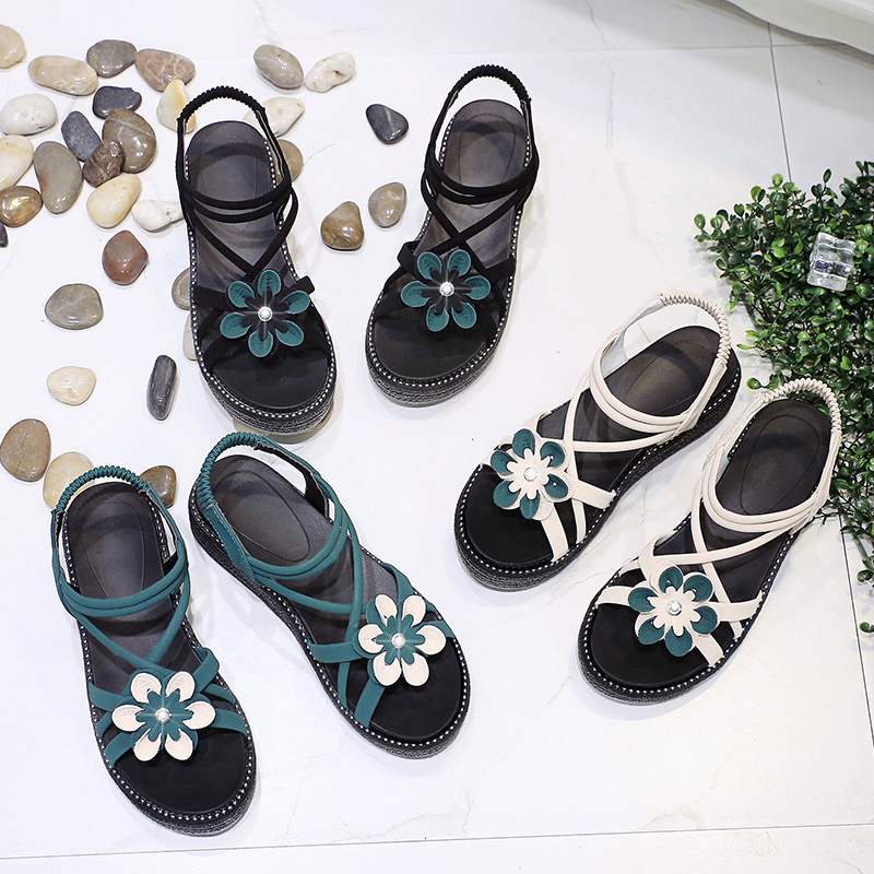 2019夏季凉鞋休闲鞋女鞋子凉鞋韩版时尚潮沙滩鞋布露趾中跟松糕鞋