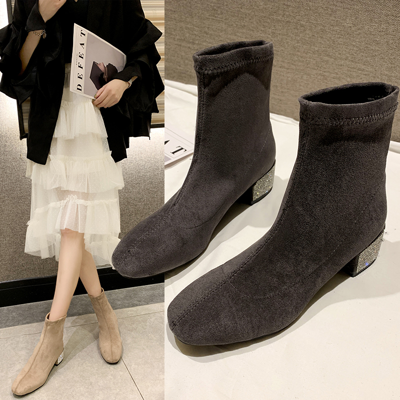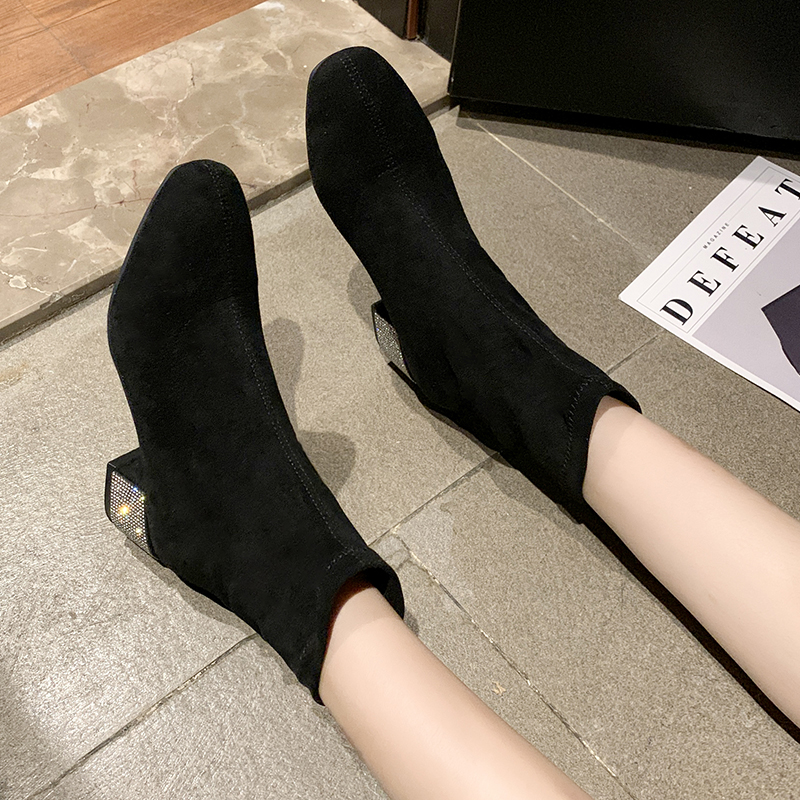 2019秋冬女靴子靴子韩版潮时尚保暖防滑绒面短靴圆头 高跟鞋粗跟