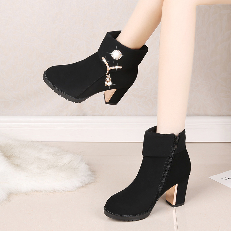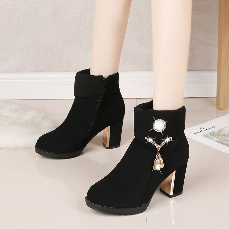 女靴子靴子韩版潮时尚保暖防滑绒面短靴圆头粗跟