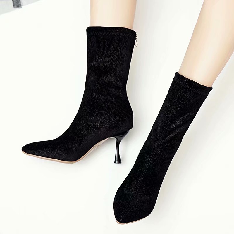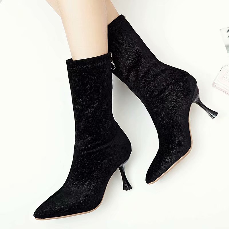 2019秋冬女靴子靴子韩版潮时尚保暖防滑绒面短靴圆头 高跟鞋粗跟