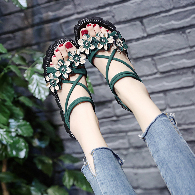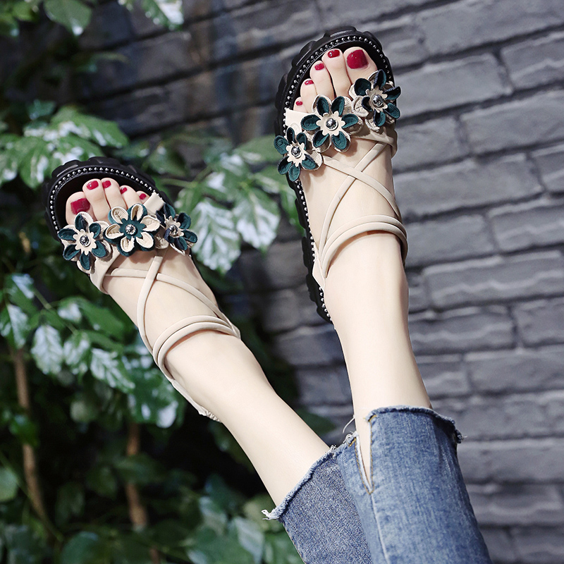 2020夏季凉鞋休闲鞋女鞋子凉鞋韩版时尚潮沙滩鞋布露趾中跟松糕鞋