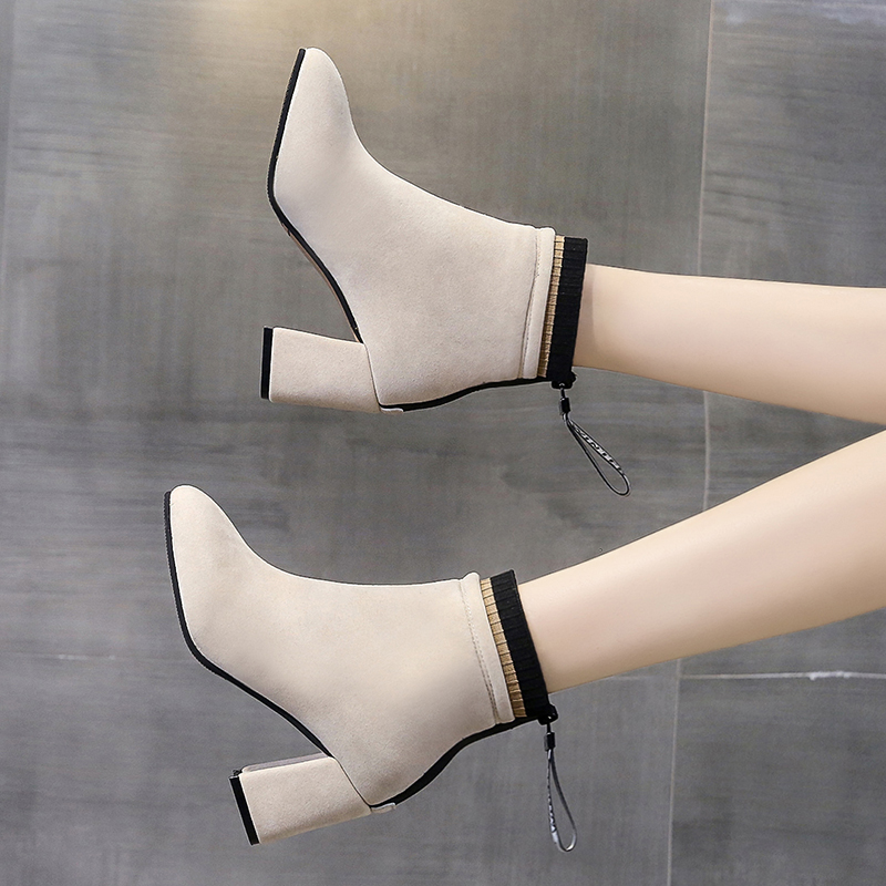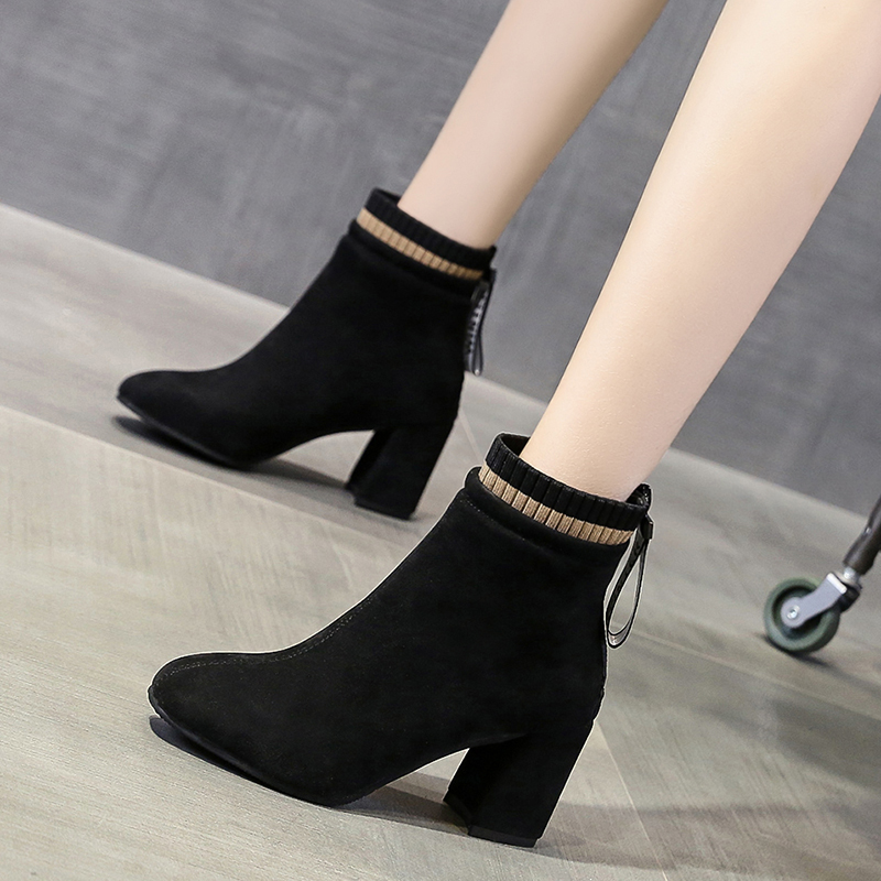 女靴子靴子韩版潮时尚保暖防滑绒面短靴圆头 高跟鞋粗跟
