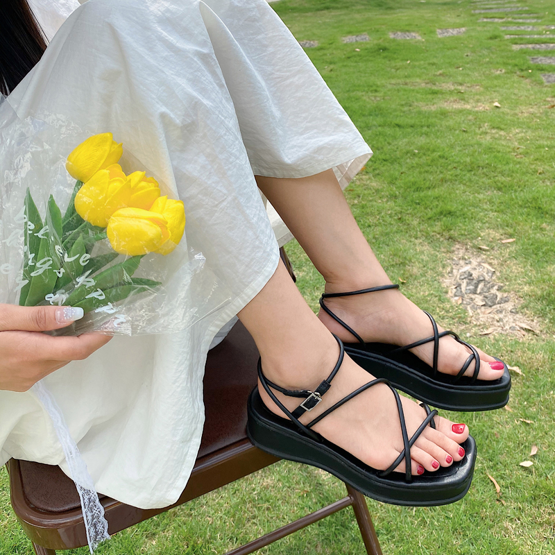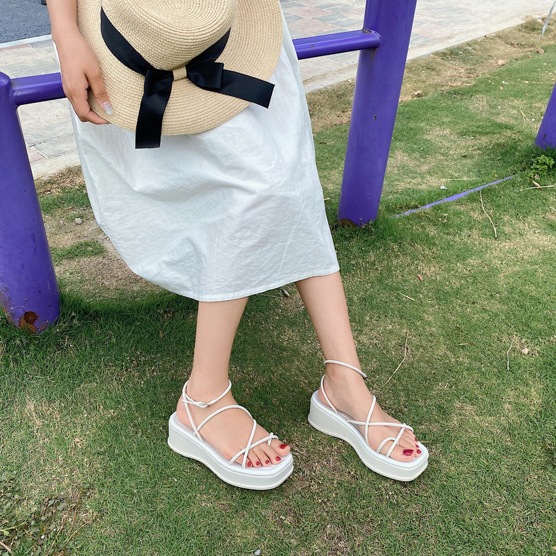 2021夏季凉鞋休闲鞋女鞋子凉鞋韩版时尚潮沙滩鞋布露趾中跟松糕鞋