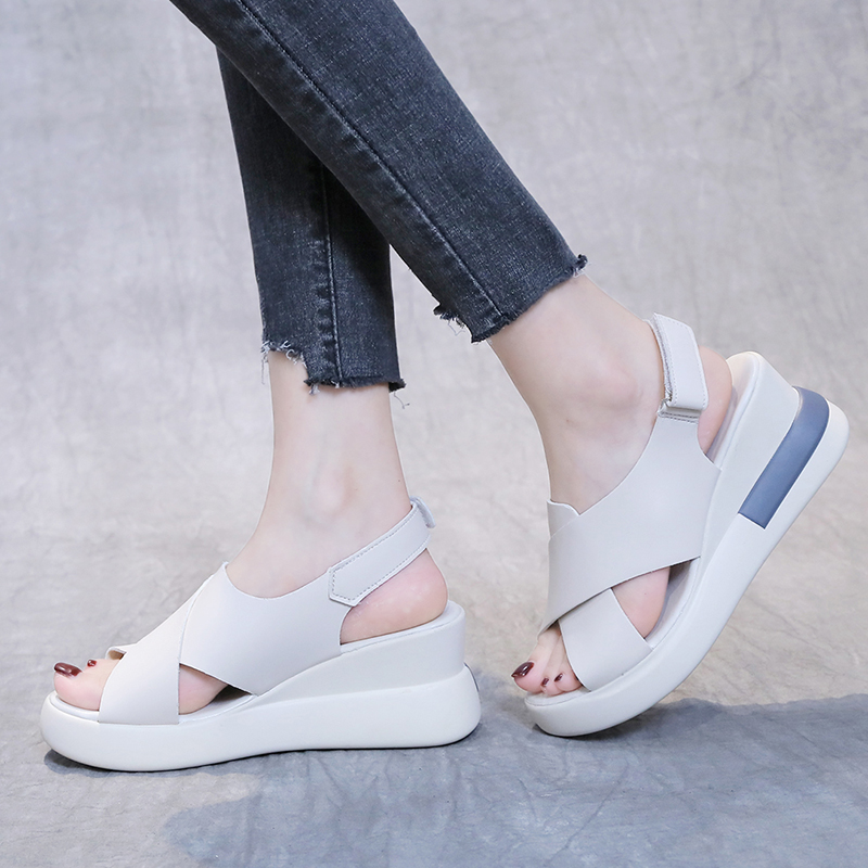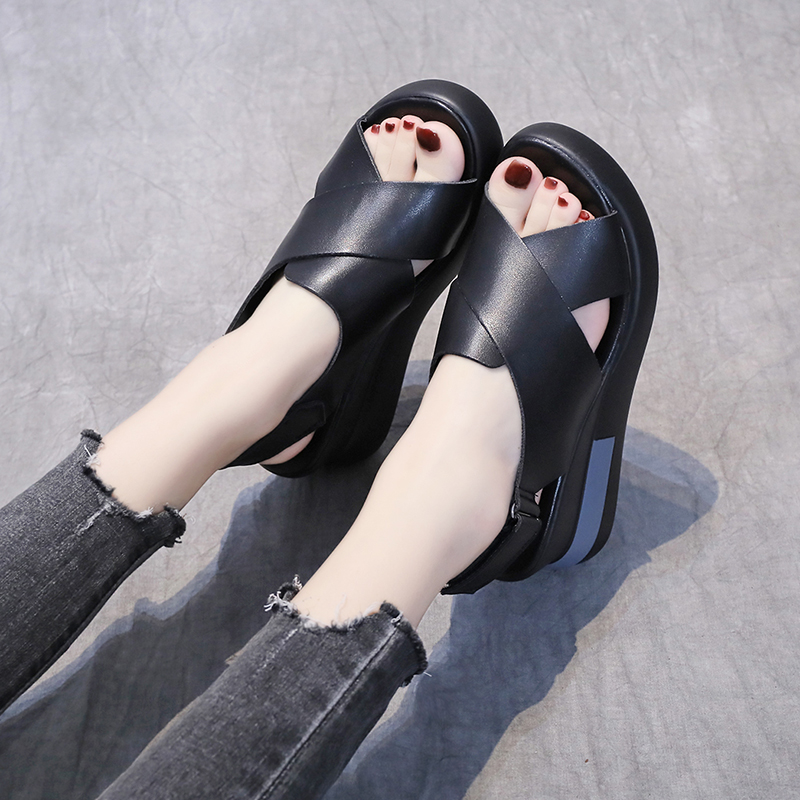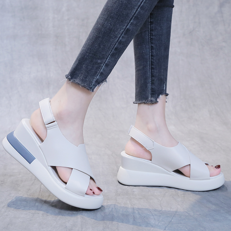 2021夏季凉鞋休闲鞋女鞋子凉鞋韩版时尚潮沙滩鞋布露趾中跟松糕鞋