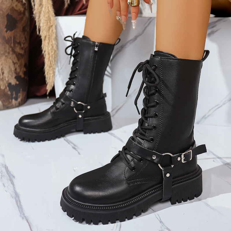 女靴子靴子韩版潮时尚保暖防滑街头骑士靴中筒靴圆头